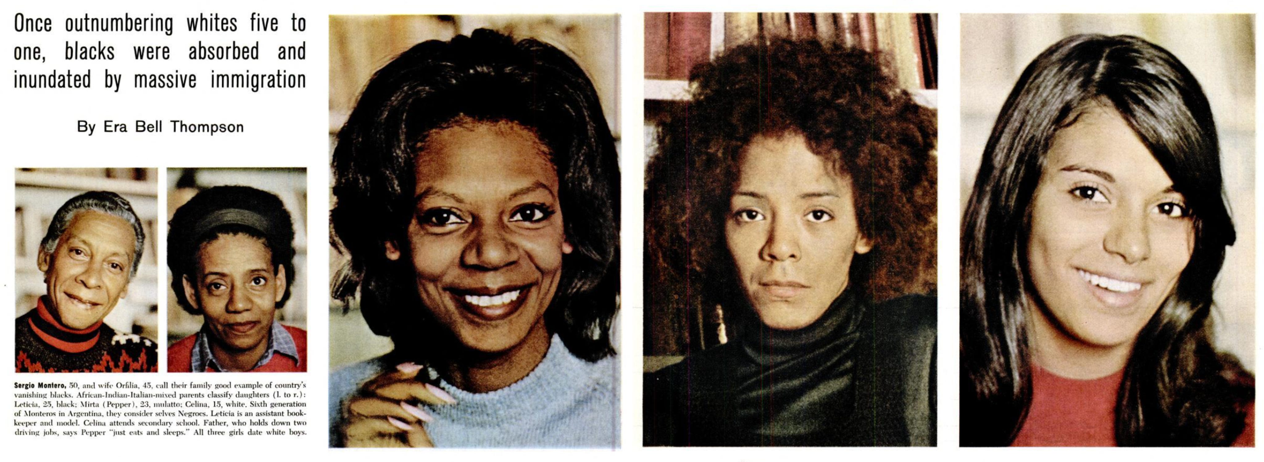 When Era Bell Thompson visited Argentina in 1973 to report on the black population there, she recorded one Argentine’s ironic complaint about the United States: “Argentines are lumped in with all the rest of the Spanish-speaking peoples, even though we are white.” Thompson had no problem finding black people, but she described them as “Not a viable, but a vanishing black people: relatively few in numbers, relatively free of racial discrimination and relatively content.”